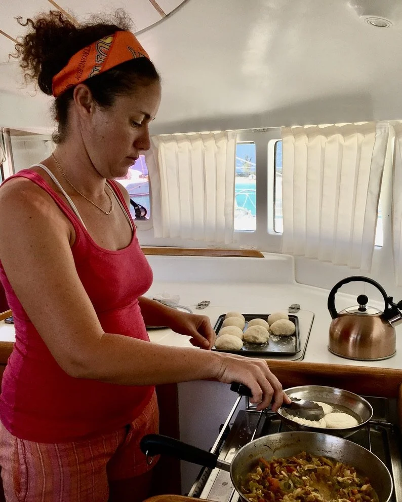 Leslieann Calliste, skilled home cook, chef, caterer. Her cooking has been featured in Gourmet Magazine. Pictured here at Las Tortugas, Paradise Beach, Carriacou, March 2025.