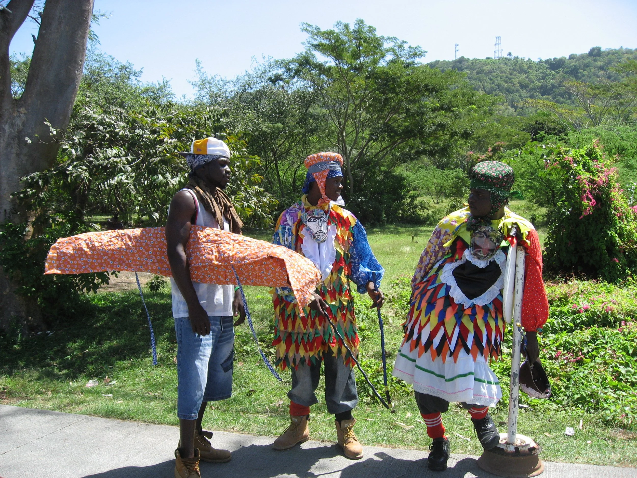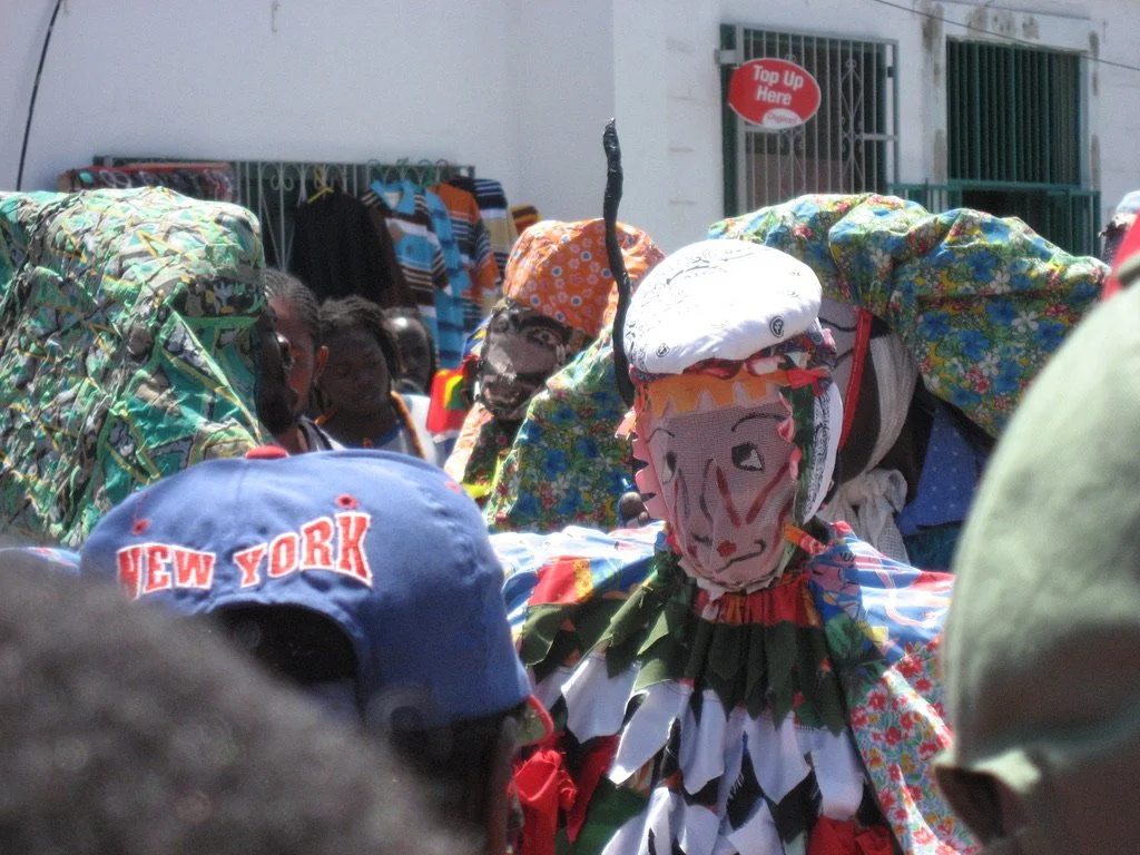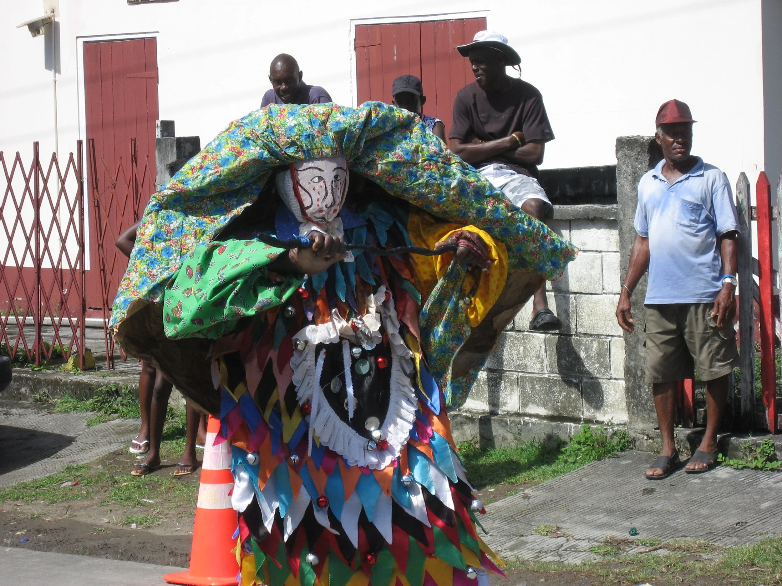 This striking performance event has taken place for decades in the tiny villages of Carriacou. Local islanders dressed in a remarkable combination of Elizabethan and African-like costume pieces and masks recite speeches from Shakespeare plays, until suddenly violent fights between one or another of the pairs of players break out. They beat each other with reinforced leather-bound sticks as weapons, their aggression gathering heat and rage. Eventually a designated referee calms the battle and the players return once more to their speeches.